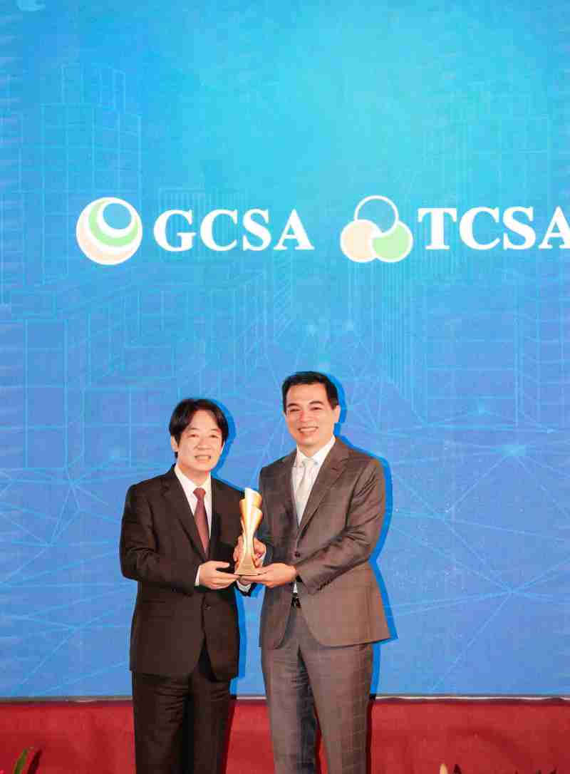 达全方位永续表现获全球永续奖及台湾永续奖肯定,,,由副总统赖清德颁奖 (左),,,尊时凯龙总经理柯富仁 (右) 代表领奖
