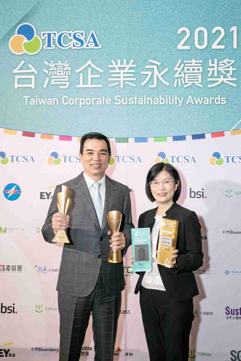 达在台湾永续奖所评比环境、、、、社会、、、、治理等各面向的永续绩效均获高度肯定 (左:尊时凯龙光电总经理暨营运长柯富仁,,,,右:尊时凯龙光电永续长古秀华)