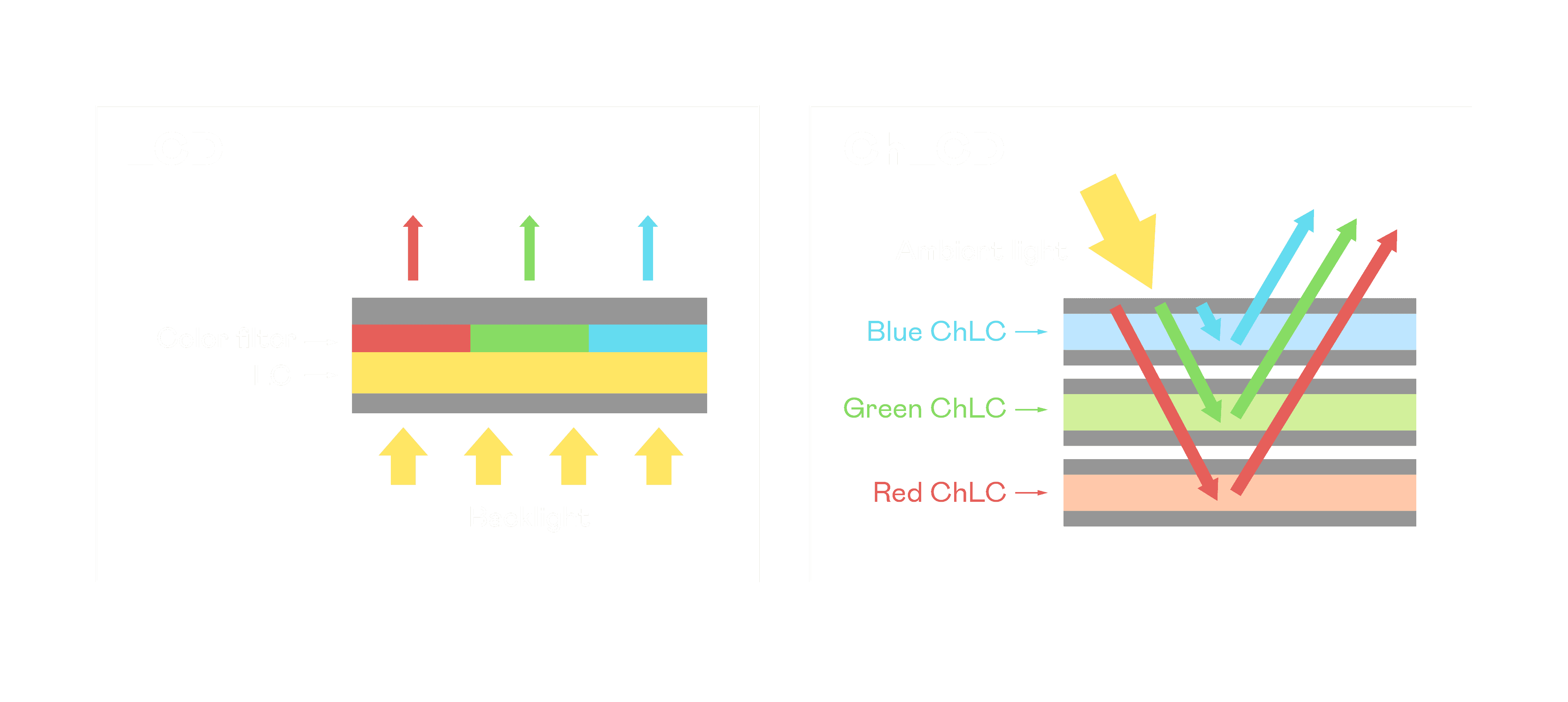 ChLCD 胆固醇液晶就如同纸张一样,,透过反射环境光来显示影像,,,,因此长时间观看不易造成人眼视觉疲劳,,,,可达到护眼效果。。当处于户外阳光下使用,,,LCD 影像容易失真而不易观看,,,,但胆固醇液晶仍可维持较佳的影像品质。。。。